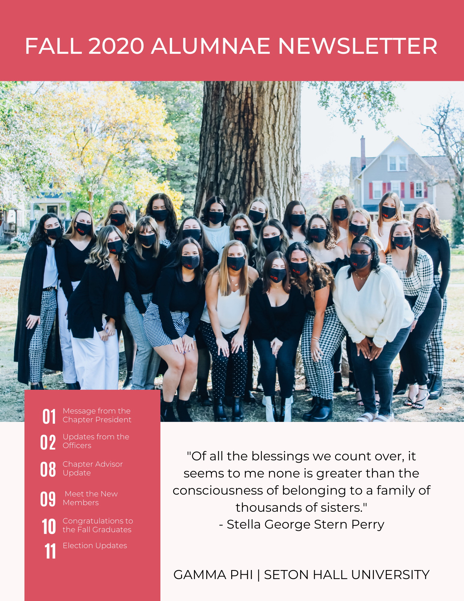 As a crucial part of documenting our chapter's history and celebrating our accomplishments, these newsletters provide insight to our chapter. Intended to keep our alumnae in the loop, these pages also hold valuable insight for parents and potential new memebers who want to learn more about our organization.